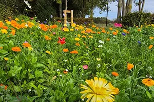 Wildflower meadows are important habitats for insects, small mammals, and birds. They also provide pollen-rich feeding grounds for pollinators like honeybees who transfer pollen from flower to flower, helping to ensure a bumper apple harvest.